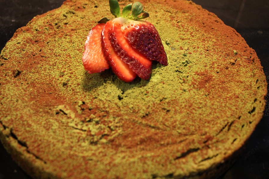 - Pull out and let cool. Once room temperature, stick in the fridge for 2-3 hours. Pull out and sprinkle the 1 tbsp remaining Matcha on top. I sprinkled on a little chocolate powder and a strawberry too, just for accent.